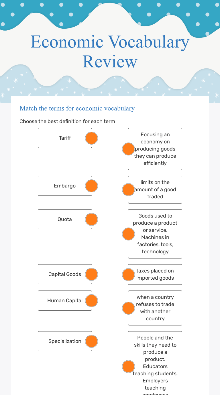 Start studying economics vocabulary worksheet. With fluentu, english economics vocabulary will become second nature to you. An organization's balance sheet gives an idea of how much they own and owe, . Use this sheet to help you: Write the vocabulary word that matches each definition below.